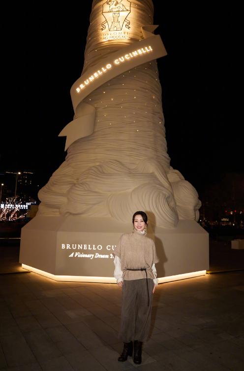 活动结束后,她也没有放过拍照的好机会,在一个白色的雕塑前,掐着口袋又拍了一张。