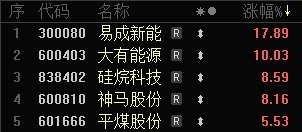 河南多家上市公司大涨。易成新能上涨17.89%,领跑豫股板块;大有能源开盘涨停,硅烷科技上涨8.59%,神马股份上涨8.16%,平煤股份上涨5.53%。上述5只豫股进入河南A股上市公司涨幅榜Top5。